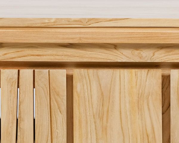 Il legno di teak è naturalmente resistente all'acqua e alla putrefazione, il che impedisce alle macchie di penetrare in profondità nel legno. Ogni giorno, tuttavia, si consiglia di eliminare gli schizzi d'acqua con un panno morbido o un panno in microfibra per evitare ristagni. Per la pulizia quotidiana, è sufficiente una spazzola a setole morbide o una spugna non abrasiva e acqua saponata per la manutenzione dei mobili. Occasionalmente, 1 o 2 volte l'anno a seconda della frequenza e dell'uso, una leggera applicazione di cera per teak incolore o trementina nutrirà il legno e ne preserverà la lucentezza, preservandone l'aspetto naturale.