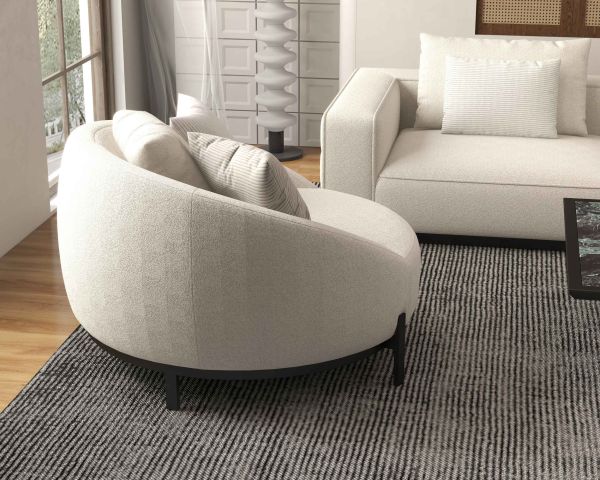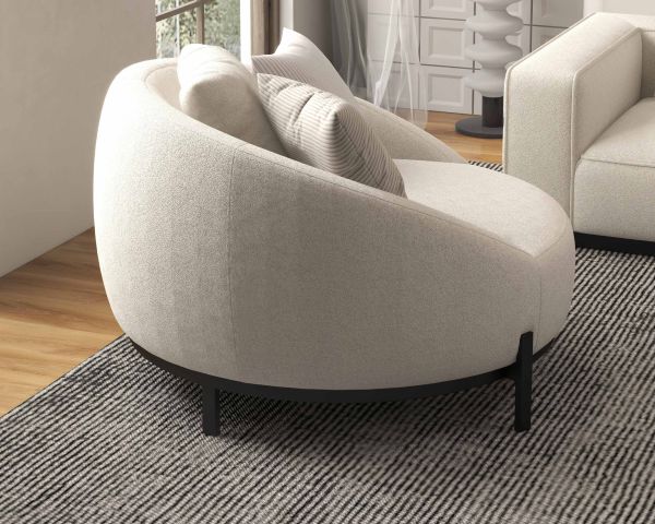 Il suo design arrotondato è elegante e discreto con quel tocco di chic che ci fa sciogliere. Il delicato contrasto tra i materiali morbidi e le tonalità beige dei cuscini in velluto a coste sono un raffinato inno al comfort, mentre la curva affusolata dello schienale offre un sostegno generoso.