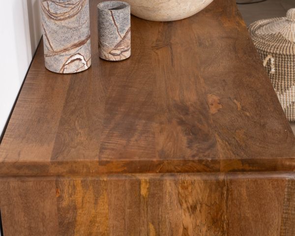Evitate i detergenti chimici, che sono aggressivi e non adatti al legno massiccio. Occasionalmente, 1 o 2 volte l'anno a seconda della frequenza e dell'uso, una leggera applicazione di cera incolore o trementina nutrirà e proteggerà il legno, preservandone la lucentezza e mantenendo un aspetto naturale.