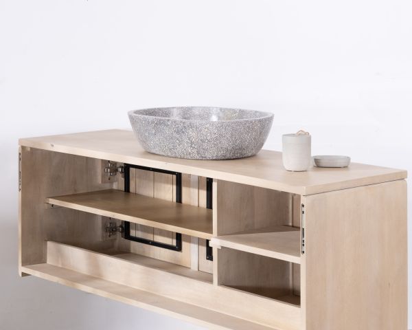 Il legno è trattato in fabbrica per resistere all'uso in ambienti umidi. Si consiglia di pulire quotidianamente gli schizzi d'acqua con un panno morbido o un panno in microfibra per evitare che penetrino nel legno e lo macchino. Per la pulizia quotidiana, è sufficiente una spazzola a setole morbide o una spugna non abrasiva e acqua saponata per la manutenzione dei mobili.