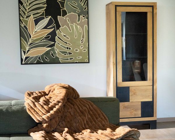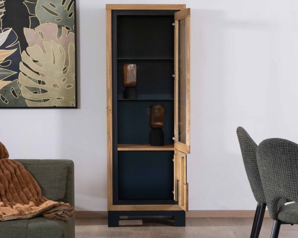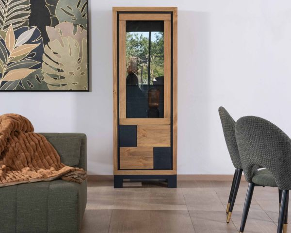 Materiali: Pino massiccio spazzolato, motivo quadrato tinto nero, schienale in MDF laccato nero, vetro