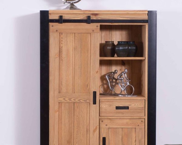 Consegnato montato, il mobile sarà subito pronto all'uso. Può essere collocato in soggiorno, in cucina o in sala da pranzo. Realizzato in metallo e pino massiccio, ha un aspetto caldo e accogliente. Sarà perfetto in uno chalet moderno in montagna o in un appartamento più moderno. Con il suo design sobrio e le sue linee pulite, può essere abbinato a un'ampia gamma di atmosfere. Vi piacerà l'anta scorrevole, ammirerete le finiture di qualità e, soprattutto, approfitterete dell'ampio spazio per riporre e mettere in mostra le vostre cornici e i vostri cimeli preferiti. Con un'altezza di 160 cm, il vostro mobile può persino ospitare una pianta sospesa come l'edera variegata. Un tocco di verde e il vostro spazio abitativo sentirà immediatamente le buone vibrazioni della natura!