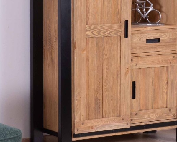 Bellissimo mobile in puro stile industriale realizzato in pino massiccio spazzolato e metallo.
