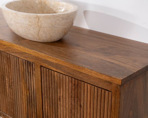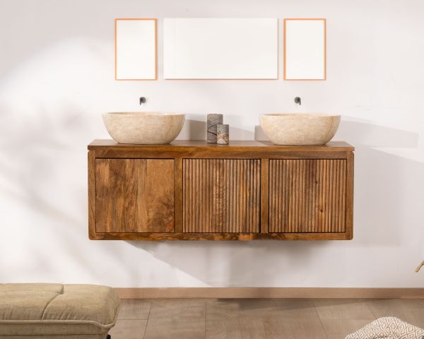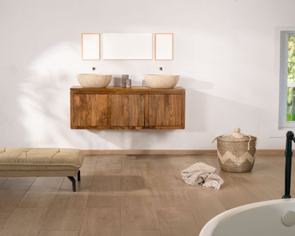 Il legno è trattato in fabbrica per resistere all'uso in ambienti umidi. Si consiglia di pulire quotidianamente gli schizzi d'acqua con un panno morbido o un panno in microfibra per evitare che penetrino nel legno e lo macchino. Per la pulizia quotidiana, è sufficiente una spazzola a setole morbide o una spugna non abrasiva e acqua saponata per la manutenzione dei mobili.