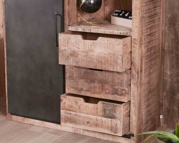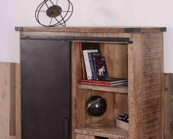 Al centro della sala da pranzo o in un angolo, questa credenza in stile industriale è un vero e proprio richiamo visivo. La forza selvaggia del legno di mango è quasi palpabile... Il robusto metallo dell'anta scorrevole carica l'aria circostante di un'aura magnetica di tensione elettrica... Questo mobile per la casa in stile industriale emana potenza fin nei minimi dettagli.