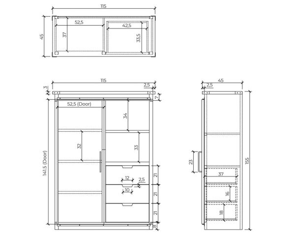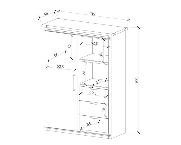 Lunghezza: 115 cm, Altezza: 155 cm, Profondità: 45 cm