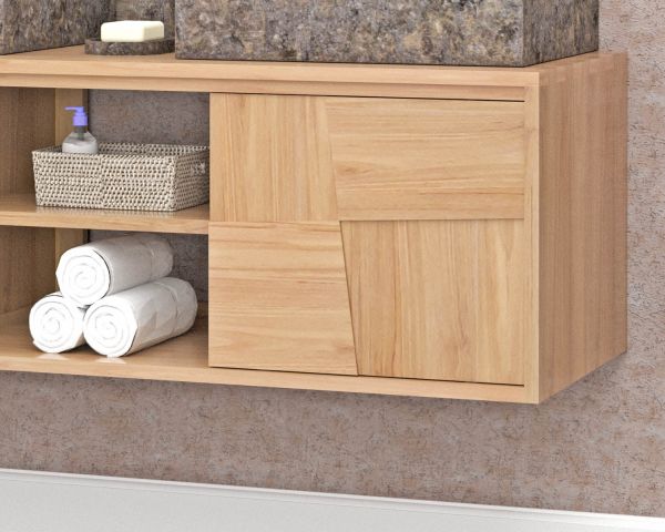 I contenitori offerti dal vostro mobile sospeso sono proprio così: eleganti e funzionali, ma perfettamente in linea con l'atmosfera zen del vostro spazio di benessere e ringiovanimento. I frontali delle ante sono rifiniti in rilievo con motivi geometrici asimmetrici che giocano con la direzione delle fibre del legno, creando un'atmosfera tipicamente etnica che si tinge di raffinatezza e armonia. I pannelli, elegantemente lavorati, scorrono agevolmente per rivelare tre vani portaoggetti, ciascuno dotato di un ripiano fisso per un'organizzazione perfetta e discreta. Se non siete amanti del minimalismo, potete aggiungere un'elegante mensola in rattan o una delicata colonna portaoggetti sospesa in teak per aumentare lo spazio di archiviazione, mantenendo il vostro spazio naturale ed esotico.