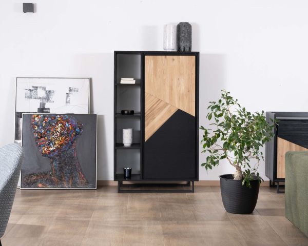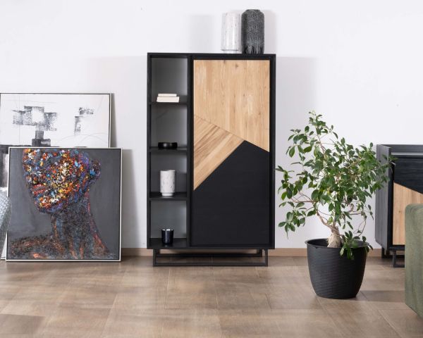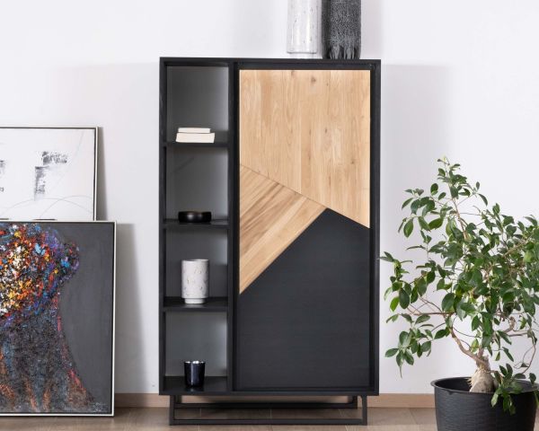 Materiali: Pino massiccio tinto nero, rovere oliato sbiancato, MDF laccato nero, gambe in metallo nero