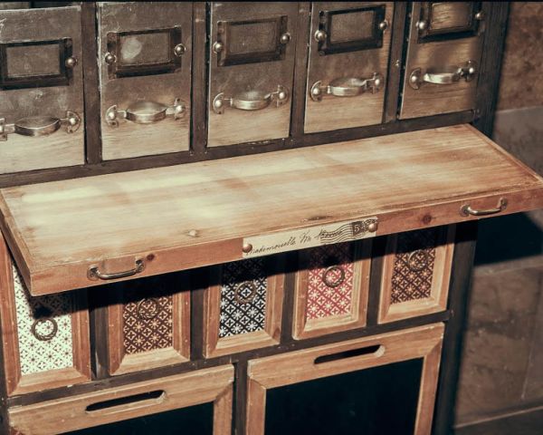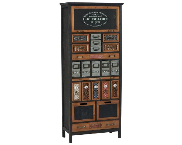 Il piano e le gambe sono in abete nero massiccio. Dispone di 21 cassetti. Si tratta di un mobile altamente decorativo con il suo patchwork di colori, motivi e materiali. Le maniglie in metallo sono di forme e colori diversi, per conferire lo stile industriale che cercate.