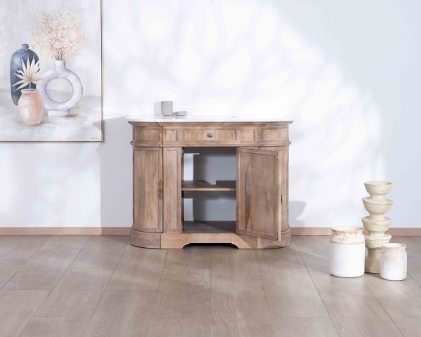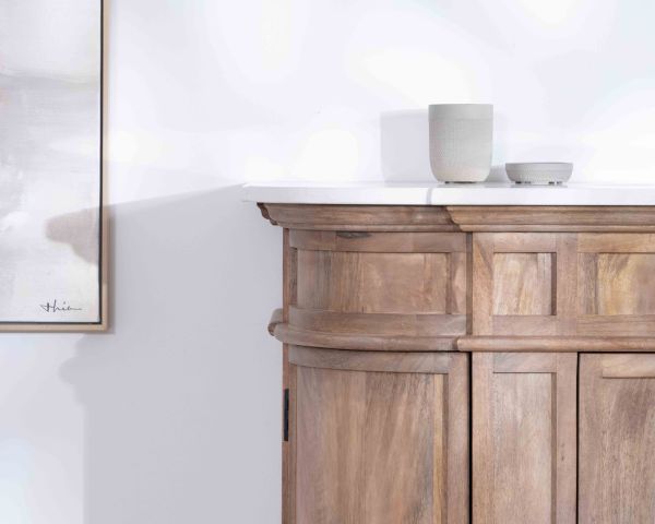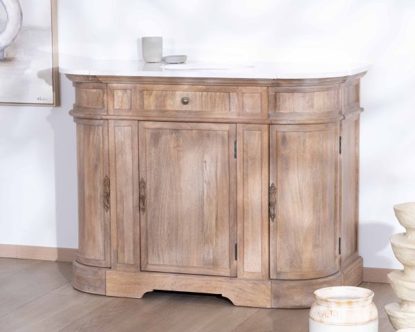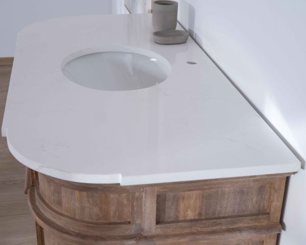 Realizzato in legno massiccio di mango, un materiale nobile e resistente, questo mobile a 1 lavabo con piano in quarzo ha un aspetto naturale, color miele, che sviluppa una bella patina nel tempo. Il contrasto tra il calore del legno e la freschezza della pietra bianca darà un tocco senza tempo al vostro bagno.