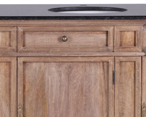 La miscela di materiali nobili e naturali utilizzata in questo mobile gli conferisce un'atmosfera autentica. Il legno di mango è una specie esotica dai colori delicatamente variegati che sviluppa una patina nel tempo. Robusto e di facile manutenzione, è un ottimo investimento a lungo termine. Anche i piani in granito sono ideali sia per la praticità che per l'estetica. Il granito è una pietra naturale e i colori delle sue venature possono variare da una stanza all'altra.