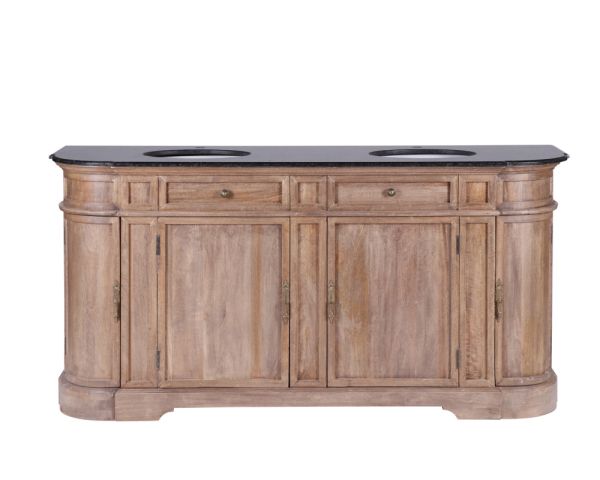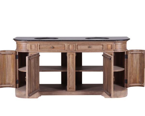 Il lavabo èspazioso e funzionale per riporre tutta la biancheria da bagno e gli accessori di uso quotidiano. Un grande armadio centrale con doppie ante in legno massiccio e due armadi laterali con ante arrotondate. I finti cassetti aggiungono il tocco finale al vostro mobile in mango massiccio.