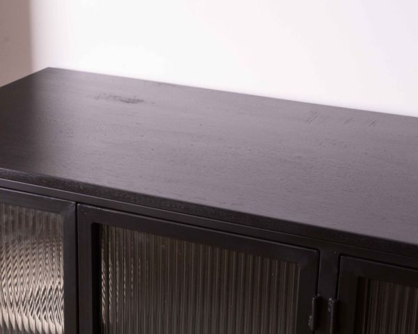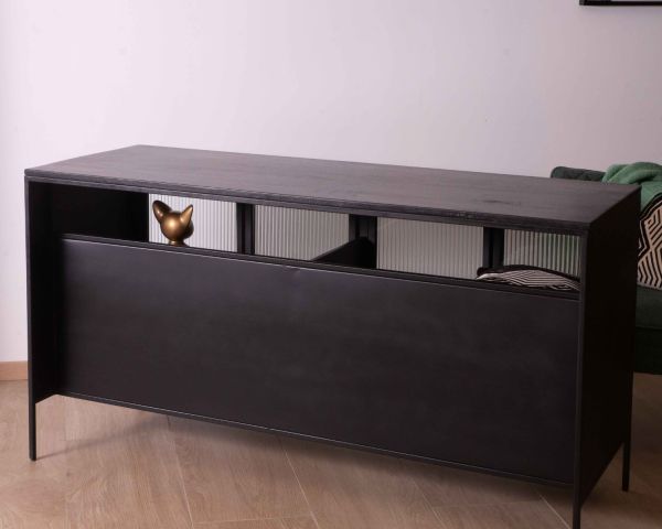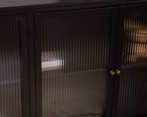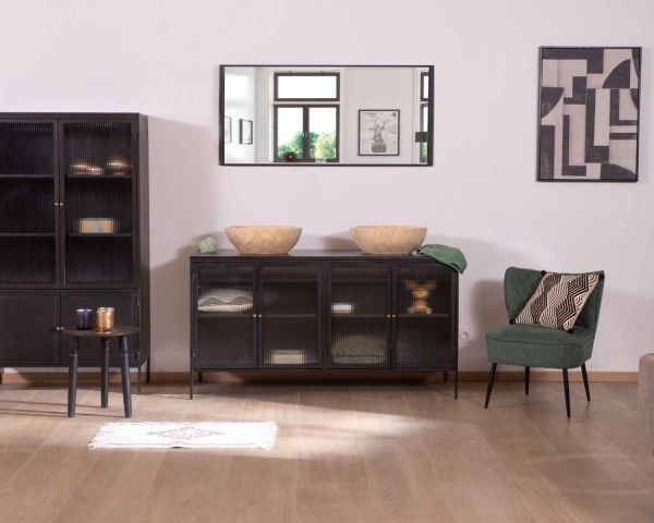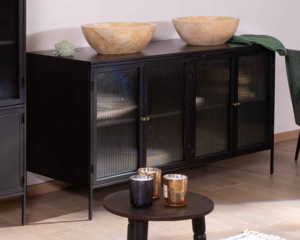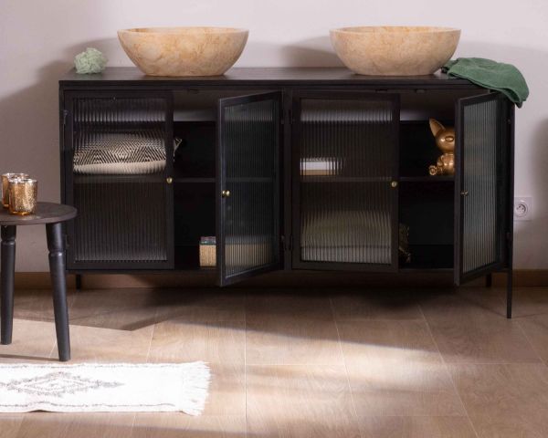 Distinguetevi dalla massa e distinguetevi dalla massa optando per mobili neo-industriali con richiami dolcemente vintage. Il vetro scanalato, con il suo aspetto ondulato, ha quel je ne sais quoi retrò che aggiunge ancora più carattere ai mobili. Le ante in vetro scanalato nascondono i vostri effetti personali e li lasciano intravedere con la giusta dose di curiosità. Le ante, con le loro maniglie a pomello, sono facili da aprire e chiudere e rimangono chiuse grazie ai magneti. Dietro le 2 ante doppie, ogni piedistallo è separato da un ripiano fisso in ferro nero, che offre un ulteriore spazio di archiviazione.