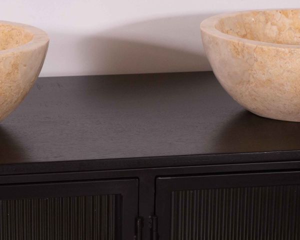 Questo mobile da bagno nero con vetro scanalato non mancherà di personalità. Con il suo piano non forato, questo mobile da bagno vi permette di scegliere i lavabi free-standing che preferite per una maggiore personalizzazione. Il mobile è realizzato in legno massiccio di mango, altamente resistente all'umidità e tinto di nero. È possibile scegliere lavabi in ceramica nera per un look totale, oppure in vetro se si desidera abbinare il materiale delle ante. Si possono scegliere anche rubinetti in stile molto contemporaneo, che si abbinano alla modernità dell'arredamento, o in resina nera. Realizzati con materiali solidi e duraturi, resisteranno all'uso frequente e quotidiano, a differenza dei mobili di fascia bassa e standardizzati.