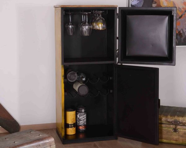 I vostri nuovi mobili sono unici. Proprio come voi. Realizzato con cura in legno naturale e metallo riciclato, questo bar giallo e metallo grezzo è una dichiarazione audace. Da solo, dà il ritmo a un arredamento più pacato. Facile da aprire grazie alle sue maniglie ergonomiche in metallo, potrà contenere ordinatamente i vostri calici e altri bicchieri, così come le varie bottiglie da aperitivo, il tutto con un aspetto gradevole. Con dimensioni di L.53 x P.40,5 x H.130 cm, è perfetto anche per gli spazi piccoli che vogliono mostrare la loro originalità.