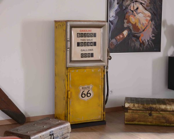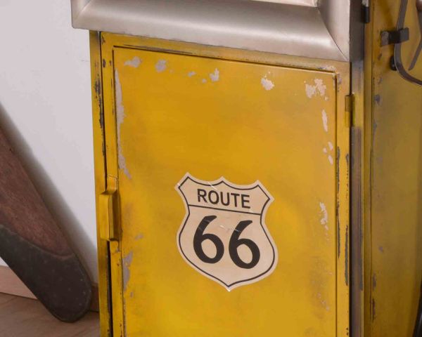 Fan della Route 66, questo mobile giallo fa al caso vostro! Darà un tocco di carattere al vostro soggiorno, al vostro salotto o alla zona aperitivo del vostro giardino d'inverno. I professionisti del settore alberghiero e della ristorazione apprezzeranno anche i suoi praticissimi portabicchieri e portabottiglie. I vostri clienti apprezzeranno sicuramente questo mobile unico realizzato in metallo riciclato. Dopo averli serviti, potranno accomodarsi su comode sedute in stile vintage o su poltrone chesterfield in pelle.