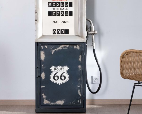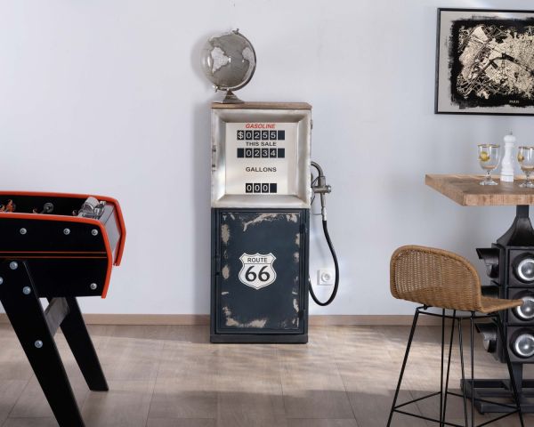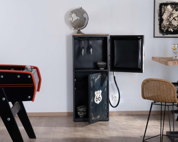 Sormontato da un piano in legno di mango, questo mobile bar con pompa di benzina è perfettamente in linea con lo spirito dello stile industriale, dove il contrasto dei materiali e i segni del tempo formano un insieme armonioso e originale, davvero seducente.