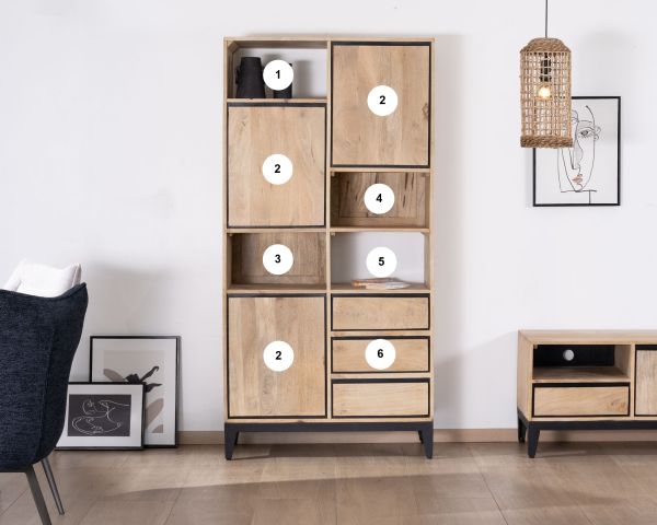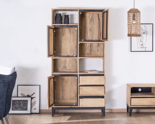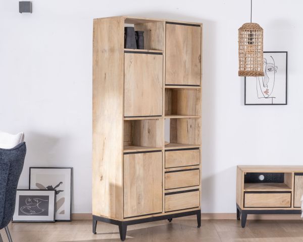 Ultra-contemporaneo con la sua disposizione destrutturata, gli accenti neri e la base in metallo, questo mobile contenitore alto aggiungerà anche un tocco di semplicità e calore grazie al legno di mango in questa finitura chiara, che rivela tutte le ricche sfumature di questa specie esotica.