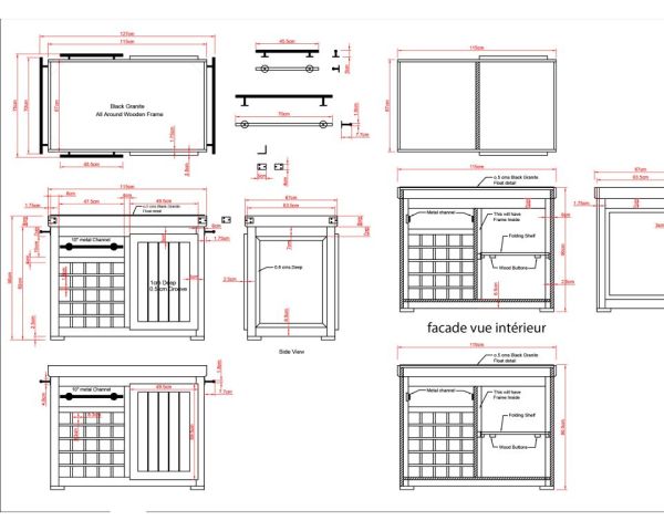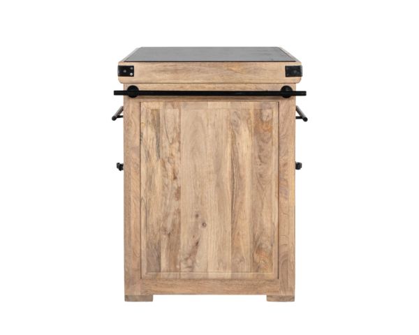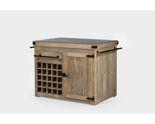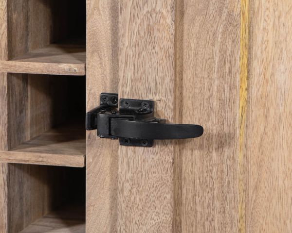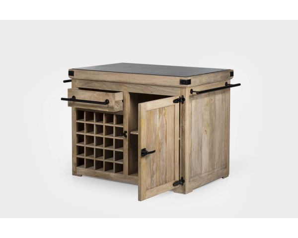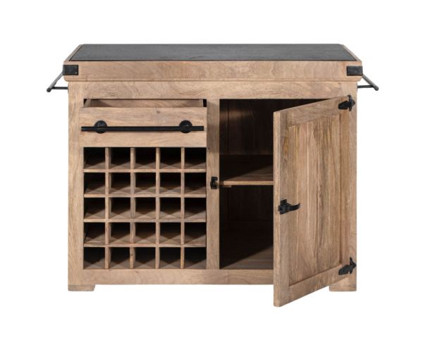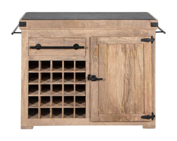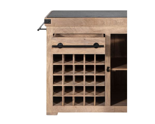 L'unità stessa offre un ampio spazio di archiviazione. Su un lato si trovano venticinque portabottiglie e un cassetto. Sull'altro lato, due nicchie e un altro cassetto per gli utensili. Un grande armadio con scaffali estraibili è accessibile da entrambi i lati. Le barre di ferro nero su ciascun lato offrono uno spazio ideale per appendere grembiuli o strofinacci, così come le maniglie dei cassetti realizzate nello stesso materiale.