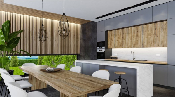 La predominanza dei colori pastello è perfetta per dare un senso di scala agli spazi piccoli, ma anche per portare un senso di calma. Le tonalità pastello catturano la luce in un tono allegro, per contrastare l'aspetto freddo e sobrio delle cucine industriali. La tendenza moderna richiede una combinazione di colori saturi. I toni intensi e puri riflettono l'atmosfera dinamica della vita urbana. I mobili verde pallido si adattano bene a un tavolo in legno chiaro per uscire dai codici prestabiliti. O forse preferite un tappeto blu chiaro sotto il tavolo della cucina color tortora. Questi piccoli contrasti ringiovaniscono l'aspetto industriale. Pensate anche al tovagliato (tovaglie, tovagliette, tovaglioli, strofinacci…) per avere un po' di rosa senza esagerare.