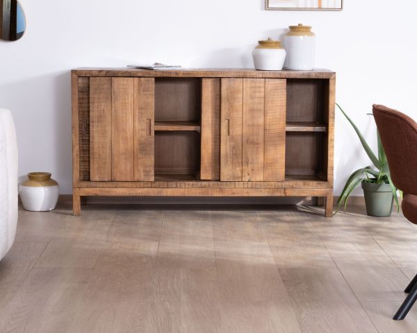 Credenza in legno massiccio di mango dal design sobrio e caldo, ideale per un arredamento naturale, bohémien o contemporaneo.