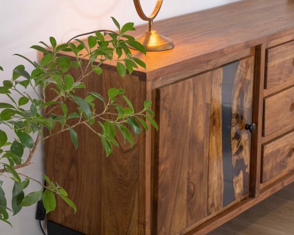 I frontali delle ante contribuiscono al carattere incredibilmente accattivante di questa credenza in acacia, metallo e resina, che può essere intuitivamente immaginata come parte di un arredamento coloniale, ma si adatta perfettamente anche a interni in stile etnico. In un ambiente più contemporaneo, aggiungerà un tocco esotico e raffinato grazie alla natura viva del legno di acacia e alla sua decorazione fossile.