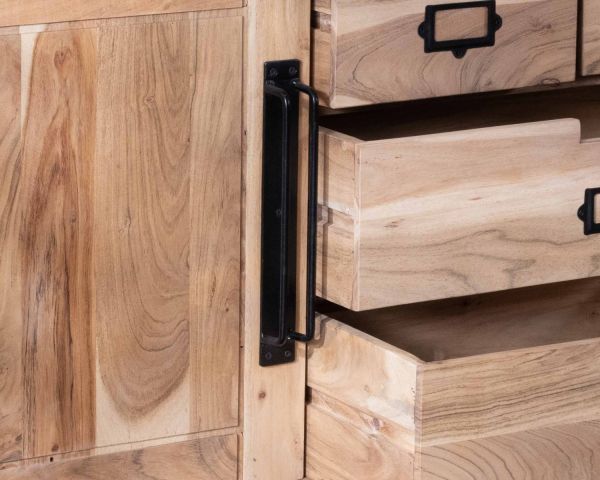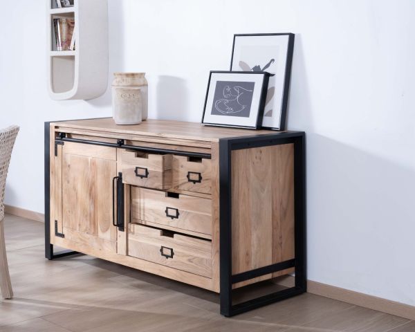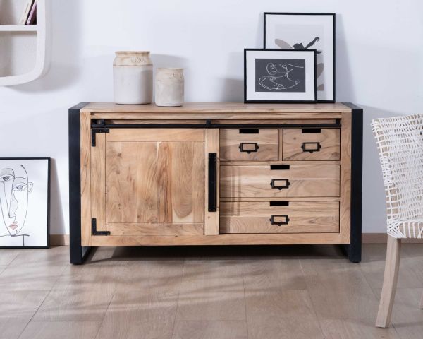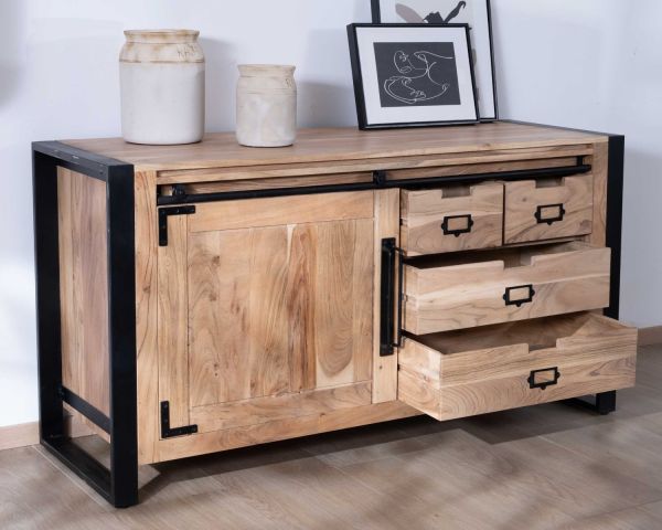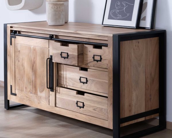 Grazie ai suoi diversi moduli di stoccaggio, la credenza industriale "Montreal" vi semplificherà la vita. Non avrete problemi a capire come riempire i suoi 4 cassetti o gli scomparti dietro l'anta scorrevole.