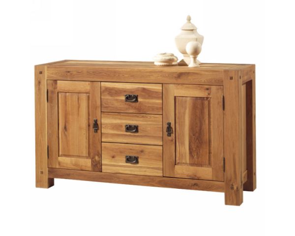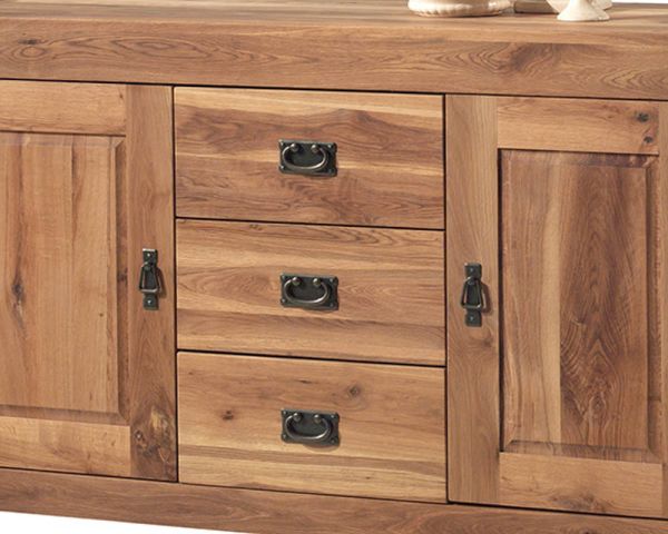 Grazie alle robuste maniglie in metallo, il vostro mobile contenitore non risentirà dell'uso quotidiano e frequente. La credenza in legno aggiungerà un tocco "chalet chic" alla vostra casa se la collocherete in un soggiorno dall'arredamento caldo e curato. Con il suo rovere oliato, il piano a doghe di rovere, i nodi e le venature autentiche, la vostra credenza è davvero bella!