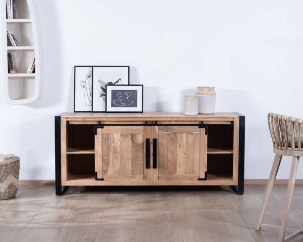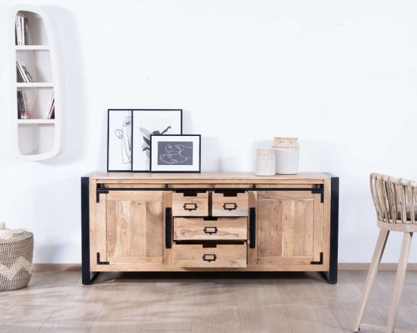 Quando la praticità incontra l'estetica... La credenza bassa o madia porterà una ventata di aria fresca nella vostra casa, facendo entrare la luce naturale per esaltare il legno massiccio di accacia. Con i suoi colori ricchi e le sue venature decise, punteggiate idealmente dal metallo nero, questo legno superbo ingrandirà il vostro spazio abitativo.