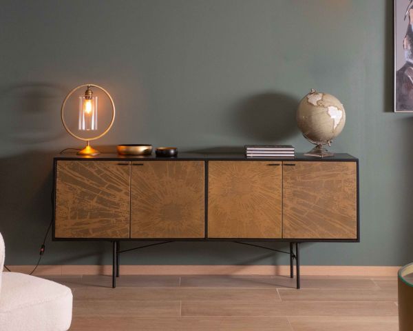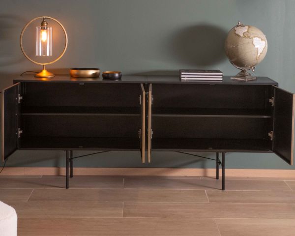 Poggiata su 4 gambe tubolari sobriamente efficaci e stabili, la cassa della vostra nuova credenza bassa si distingue per la sua eleganza e la sua personalità carismatica. Le 4 ante, ognuna unica, nascondono 2 grandi moduli di contenimento, a loro volta divisi in 2 da un ripiano in metallo. Senza montante centrale, è ancora più facile riporre le vostre cose e i grandi piatti ereditati dalla nonna. E poiché le porte sono chiuse da magneti, non c'è il rischio che si aprano accidentalmente. Per proteggere le vostre cose da mani curiose e talvolta maldestre... In una sala da pranzo, in un giardino d'inverno o anche in soggiorno, questo mobile di design si inserisce perfettamente. I suoi colori chic daranno un tocco di stile alla vostra casa. Idealmente, i colori opachi o bianchi esalteranno il look nero e ottone.