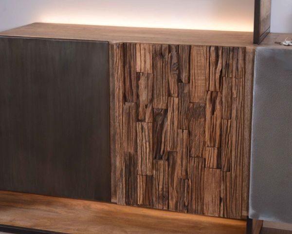Riponete i vostri oggetti dietro le 3 ante con frontali unici. Lamiera, legno riciclato e impiallacciatura di cemento strutturato si combinano per creare un risultato unico. In combinazione con la struttura in ferro saldato che circonda la solida struttura in mango, questi materiali conferiscono un tocco moderno all'insieme.
