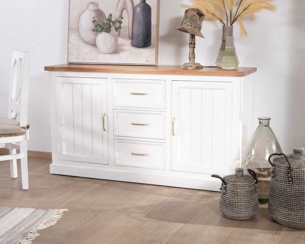 Con una lunghezza di 165 cm, questa credenza in legno offre un ampio spazio pratico per riporre due armadi e tre cassetti per gli oggetti di uso quotidiano in una casa dove la convivialità regna sovrana.