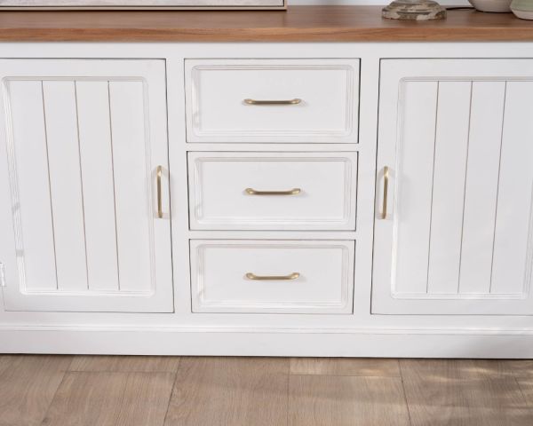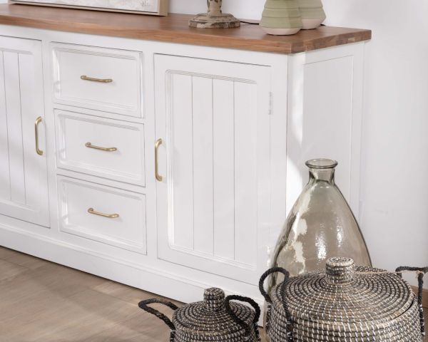 Il bianco fresco e allegro di questa credenza aggiunge un tocco semplice e armonioso al suo design sobrio. Inoltre, crea un contrasto rilassante con il calore dell'acacia, il cui piano e i cui ripiani sono lasciati al naturale. Insieme, formano un mobile contenitore dall'estetica meticolosa e dalla delicata reinterpretazione dell'autenticità, incarnando perfettamente lospirito country-chic.