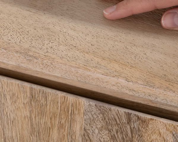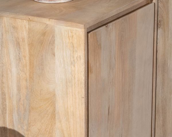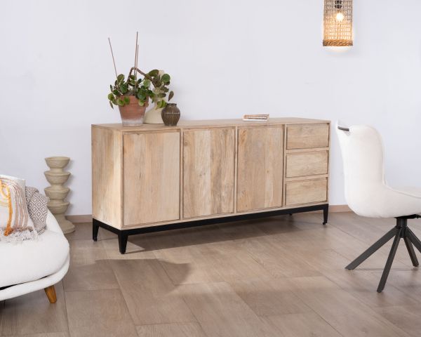 Il materiale principale di questa credenza in stile scandinavo è il legno di mango naturale con finitura sabbiata, finemente strutturato, che emana una semplice morbidezza esaltata dalla base in metallo nero. Questo contrasto di materiali e colori aggiunge un tocco contemporaneo allo stile di questa credenza da 180 cm.