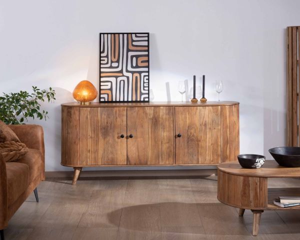 Il suo design arrotondato e la finitura scanalata dei frontali conferiscono a questa credenza lunga 175 cm un'energia morbida e armoniosa e un fascino senza tempo. Questo delicato rilievo mette in risalto i ricchi colori naturali del legno di acacia.