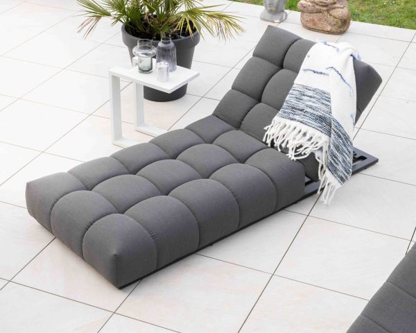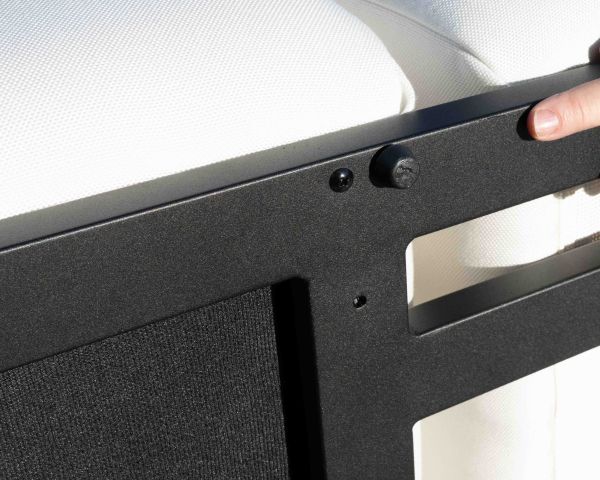 Le gambe in alluminio nero e il sistema a cremagliera sono trattati contro l'ossidazione, rendendo il lettino molto leggero e facile da spostare.