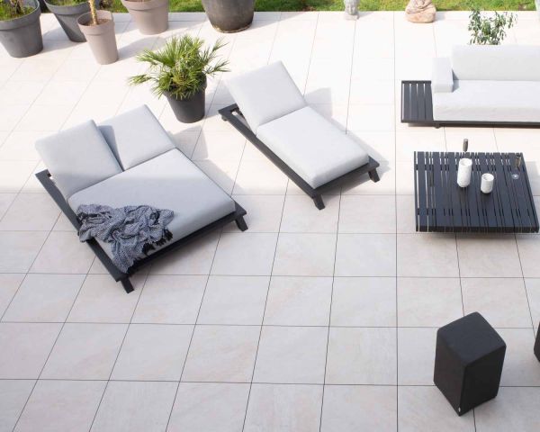 L'elegante struttura in alluminio sottolinea ilmaterasso di 18 cm di spessore, che aspetta solo di accogliervi comodamente come farebbe il vostro divano. La differenza è che questa chaise longue dalle dimensioni generose è leggera, quindi potete spostarla facilmente per posizionarla come desiderate per i vostri momenti di pace e tranquillità. Adottate la posizione più comoda per i vostri momenti di relax regolando l'inclinazione dello schienale grazie all'ingegnoso sistema a cremagliera.