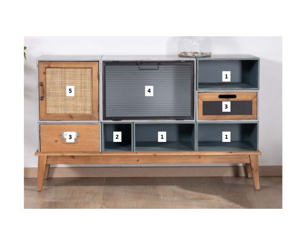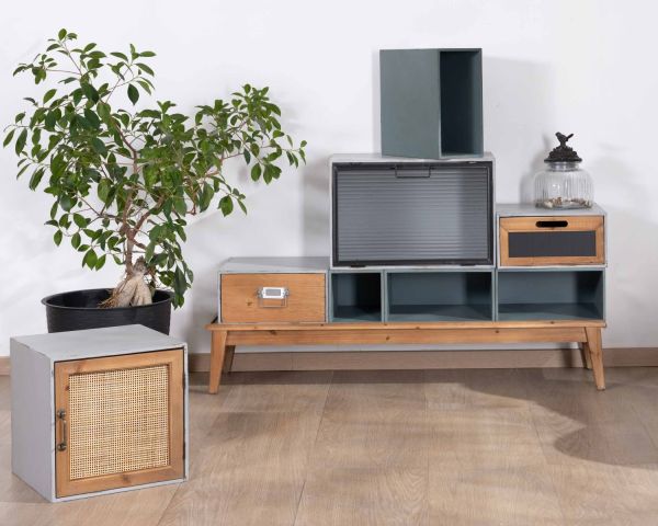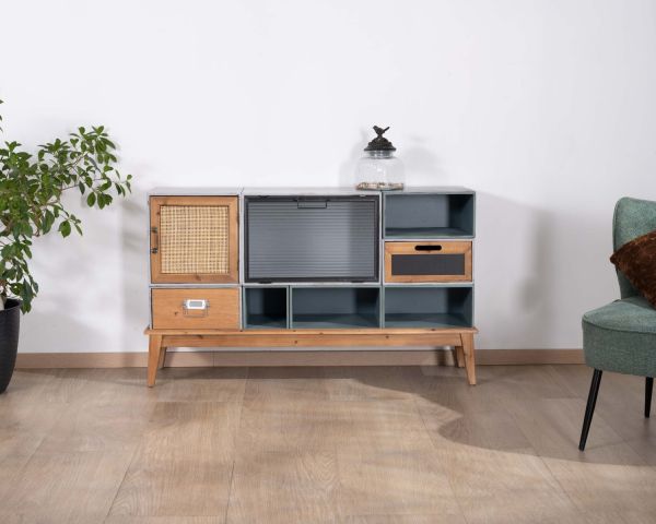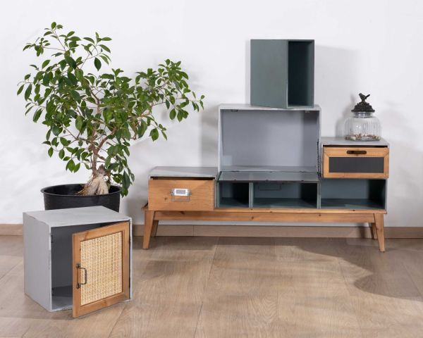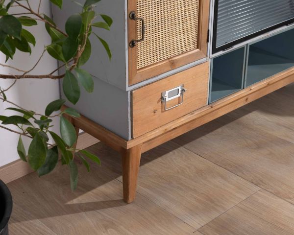 Materiali: Abete massiccio, metallo, MDF, rattan, vetro