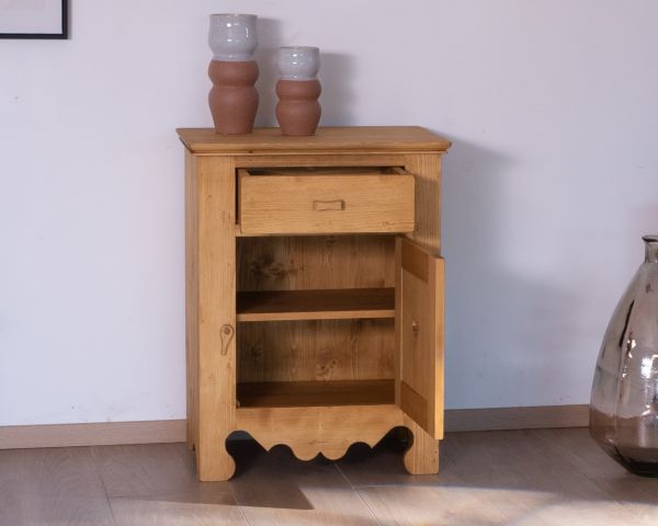 Con le sue linee pulite e il suo profilo compatto, questa credenza si adatta perfettamente a spazi ridotti, pur rimanendo un punto focale di fascino e carattere. La costruzione solida e il legno di pino naturale ne testimoniano l'artigianalità e la durata.