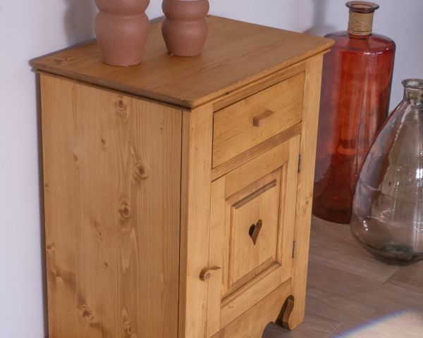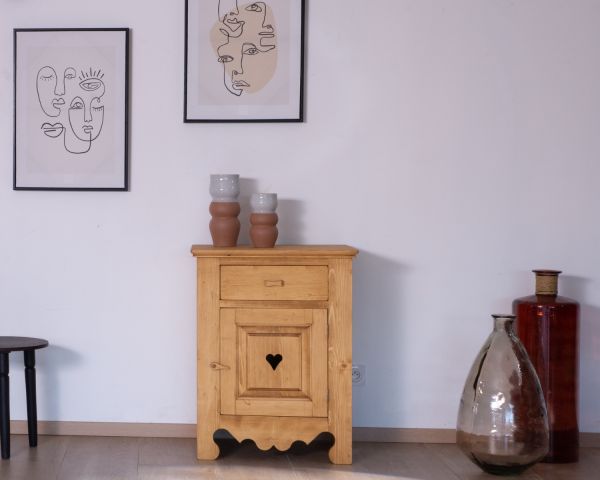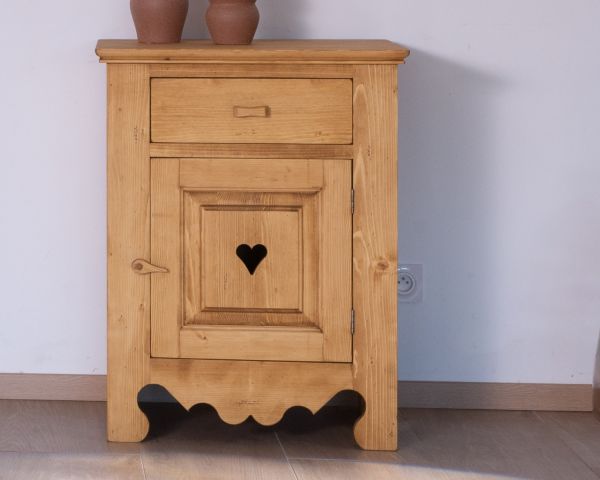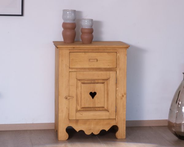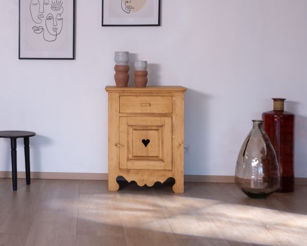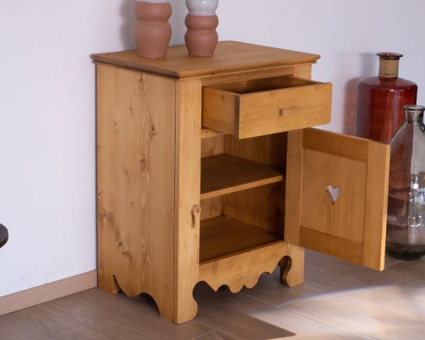 Il cassetto superiore e l'anta a battente offrono un pratico spazio per riporre molti oggetti. Il delicato dettaglio del taglio a cuore sull'anta conferisce a questo mobile contenitore un'atmosfera accogliente e country, che invita a condividerlo con gli altri.