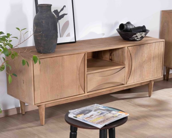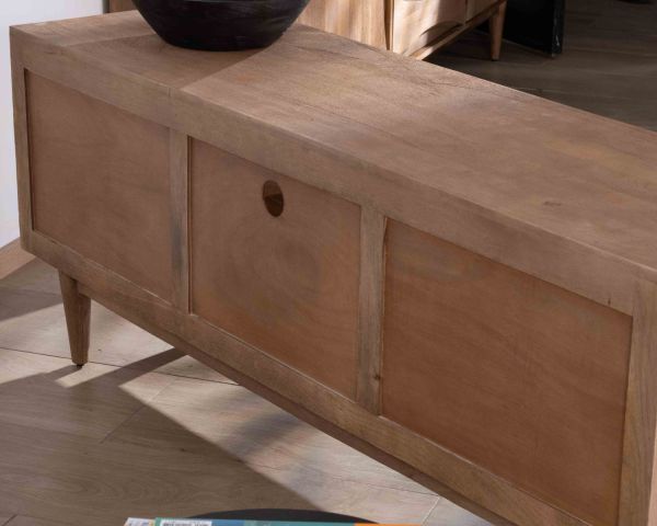 L'aspetto naturale e ordinato di questo mobile TV in legno di mango si sposa perfettamente con il concetto Japandi, che combina l'eleganza minimalista giapponese con la funzionalità scandinava, per un interno in cui serenità e semplicità vanno di pari passo.