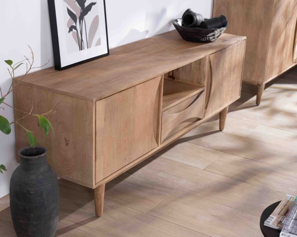 Le linee pulite e i frontali ad arco con maniglie incassate di questo mobile da soggiorno sottolineano la sua estetica zen, mentre la finitura sabbiata del legno di mango espone delicatamente le venature naturali e le varie sfumature del legno, evidenziandone la bellezza e l'autenticità.