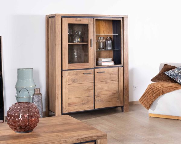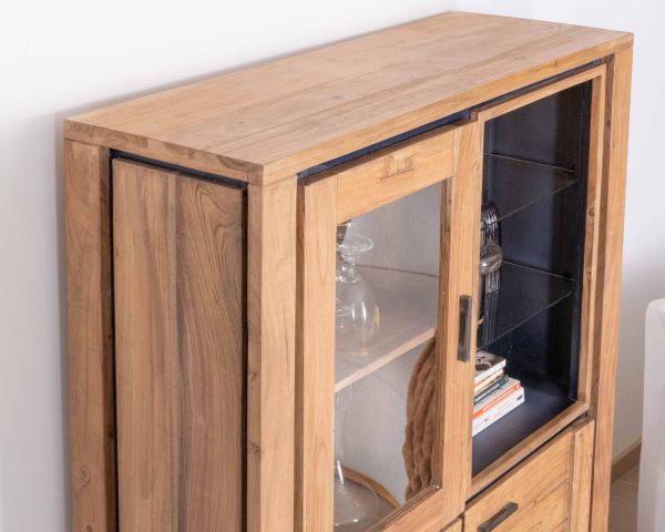 Materiali: Acacia massiccia, vetro, compensato (schienale degli armadi), metallo (maniglie)