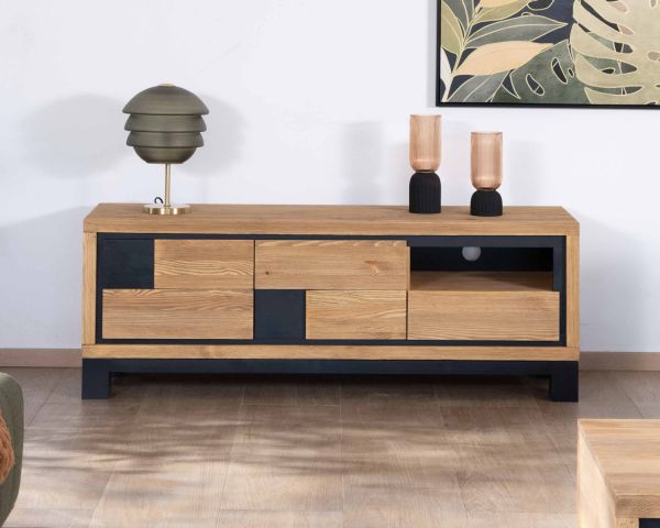 Materiali: Pino massiccio spazzolato, motivo quadrato tinto nero, schienale e fondo cassetto in MDF laccato nero