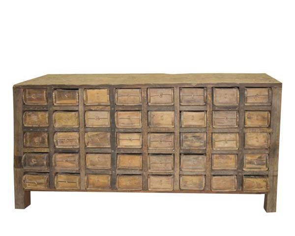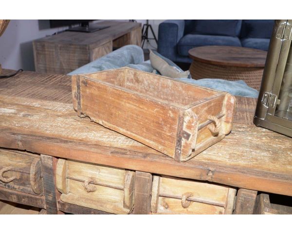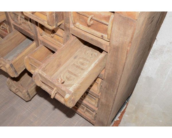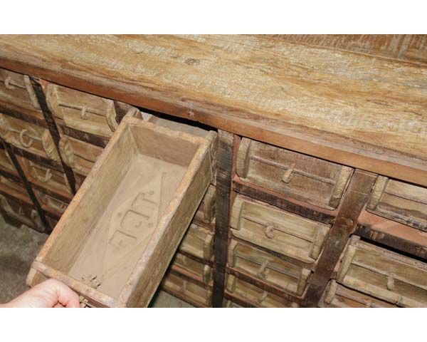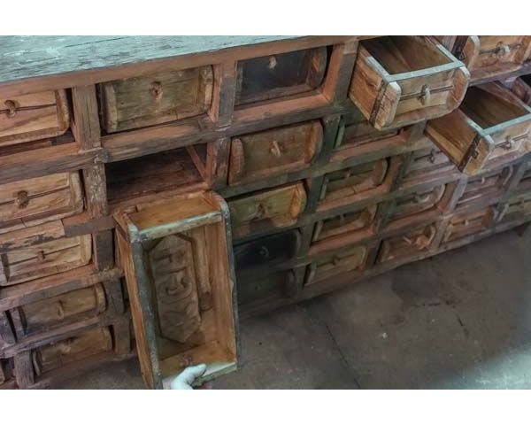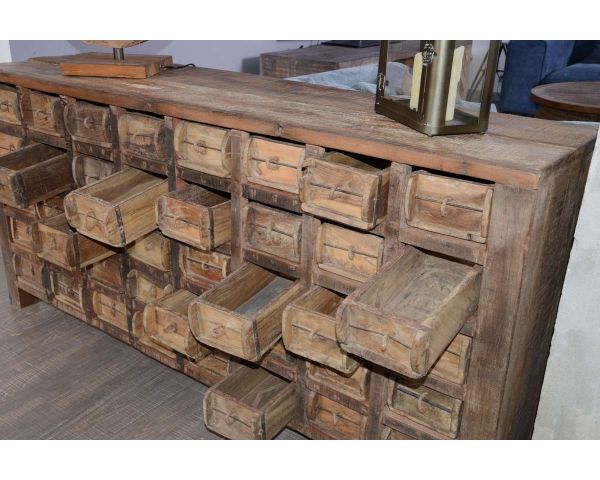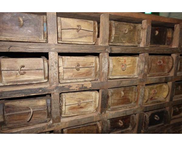 Il piano di questa cassettiera, ad esempio, rimane complessivamente dritto, ma non ci si deve aspettare un mobile perfettamente liscio e privo di ammaccature o fori, anzi. I pezzi di legno utilizzati conservano tracce del loro passato e sono volutamente evidenziati. I cassetti sono vecchi stampi per mattoni di fango usati in India per costruire o restaurare vecchie strutture.