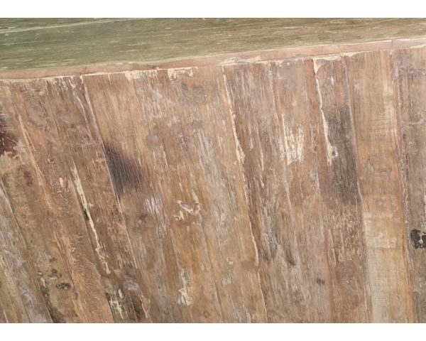 In termini di fabbricazione, ogni cassettiera è diversa e unica. È realizzata con legno riciclato come sheesham, mango, traverse e altri, che hanno avuto un primo utilizzo e hanno trovato una seconda vita in questa creazione. I pezzi di legno possono quindi essere più scuri o più chiari. Vecchie macchie bluastre o rossastre possono apparire leggermente, anche se i colori originali del legno sono sbiaditi. L'aspetto destrutturato viene mantenuto ed evidenziato in questo prodotto.