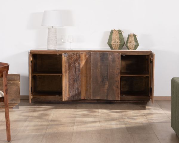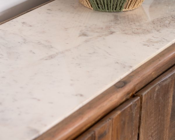 Questa credenza in legno riciclato e marmo bianco della collezione "Mood" è un bellissimo mix di materiali organici e minerali. Al tempo stesso etnico e chic, ruvido e lucido, questo mobile contenitore basso è pieno di carattere e unicità, pur offrendo due grandi armadi.