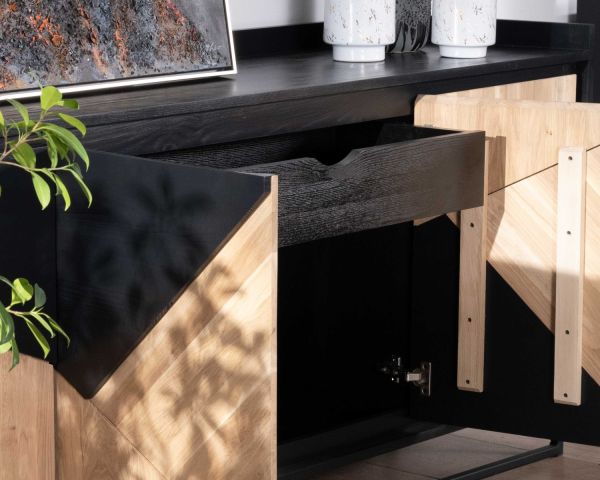 Materiali: Pino massiccio tinto nero, rovere oliato sbiancato, MDF laccato nero, gambe in metallo nero