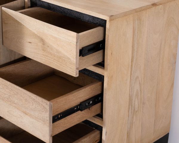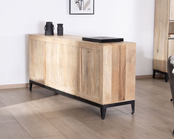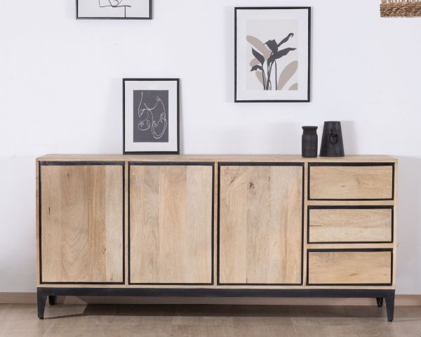 Grafica ed elegantemente strutturata, questa credenza bicolore in mango naturale della collezione "Bocca" è uno stile contemporaneo con un tocco di calore organico. Le cornici verniciate di nero contrastano con le tonalità del legno chiaro per esaltare il carattere sobrio di questo mobile contenitore, sottolineandone le linee pulite.