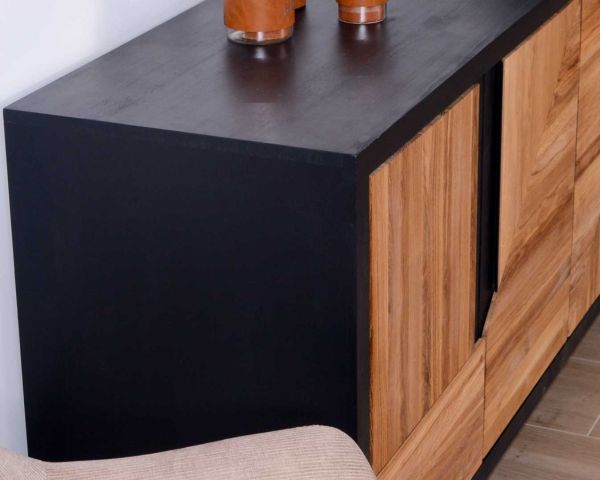 Credenza "Flix" nera e legno in stile contemporaneo a 4 ante e 1 cassetto